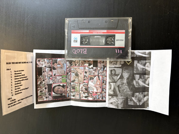 Cassette with the first three volumes of the ”You are not alone” series. Recorded 2024 / 2025. Previous released on CD-r and lathe cuts. Handmade covers with mini versions of ”adult -star” collages from upcoming artbook - You are not alone. Dubbed on re-used cassettes. 70+ minutes of music.